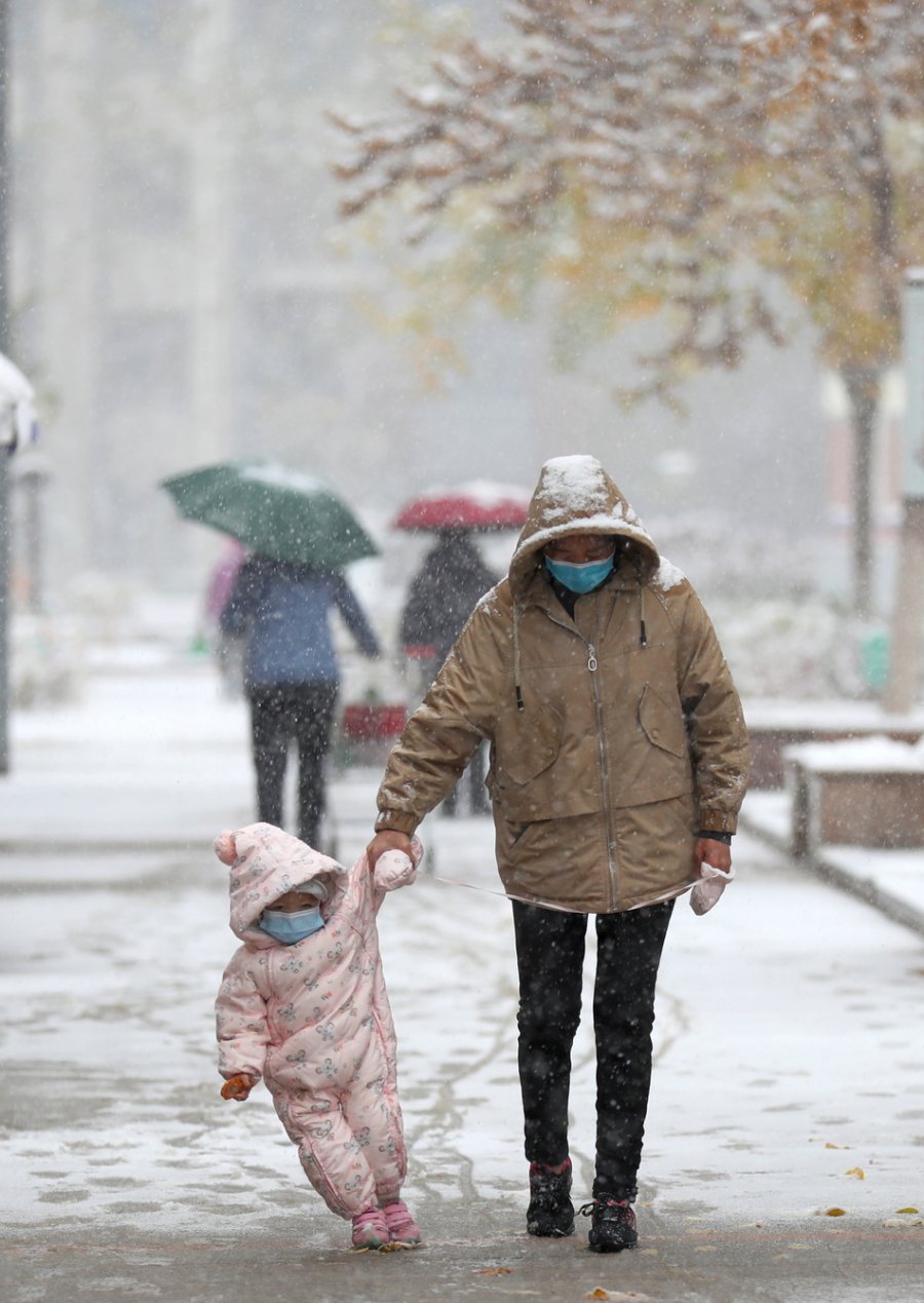 2021年11月6日,内蒙古自治区呼和浩特市,民众在雪中出行。当日,当地气象部门分别发布道路结冰黄色预警、大风蓝色预警、暴雪蓝色预警。