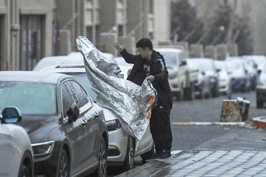 2021年11月6日,长春市民用车衣将爱车保护起来。受高空冷涡和地面倒槽共同影响,长春市迎来了入冬以来首场明显降雪天气。