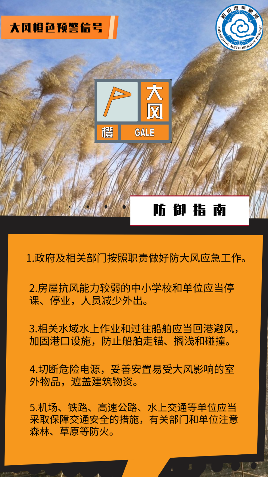 郑州市气象台2021年11月06日23时35分发布大风橙色预警信号:预计未来6小时内,西部山区及新郑南部将出现9到10级大风,局地阵风11到12级。请注意防范。
