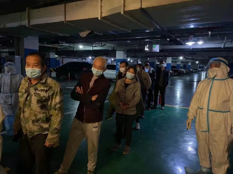 △成都高新区石羊街道保利百合花园小区滞留工人核酸采样现场