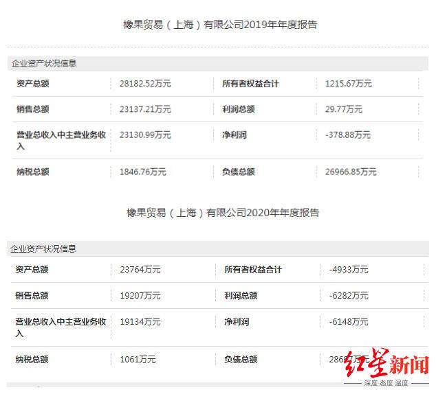 从橡果贸易已公示的运营情况可以看到,2019年,其利润总额仅29.77万元,净利润为-378.88万元,负债总额更是达到了近2.7亿元。到了2020年,橡果贸易所有者权益及利润总额急转为负,净亏损达到了6148万元,较2019年亏损扩大了5769万元,负债总额增长至2.87亿元。