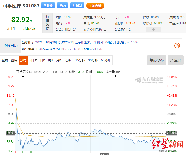 从二级市场表现来看,可孚医疗股价始终表现低迷,仅于上市第二天盘中触及95元/股的高点。截至11月8日收盘,可孚医疗收跌3.62%,报82.92元/股,总市值132.7亿元。