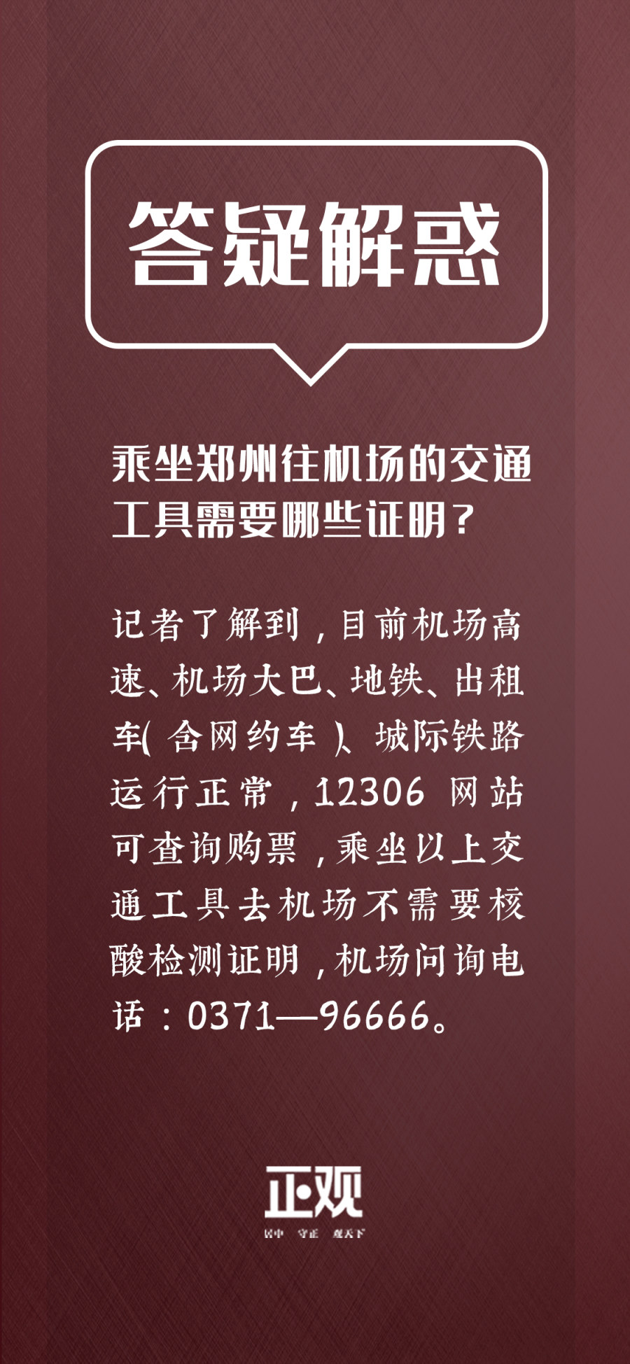 记者了解到,目前机场高速、机场大巴、地铁、出租车(含网约车)、城际铁路运行正常,12306网站可查询购票,乘坐以上交通工具去机场不需要核酸检测证明,机场问询电话:0371---96666。