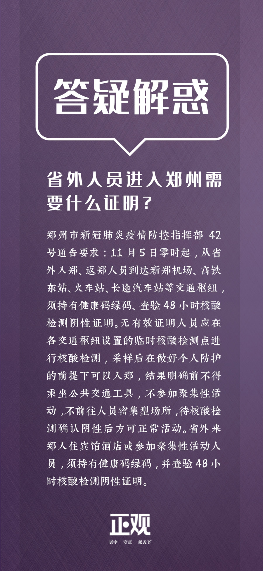 郑州市新冠肺炎疫情防控指挥部42号通告要求:11月5日零时起,从省外入郑、返郑人员到达新郑机场、高铁东站、火车站、长途汽车站等交通枢纽,须持有健康码绿码、查验48小时核酸检测阴性证明。无有效证明人员应在各交通枢纽设置的临时核酸检测点进行核酸检测,采样后在做好个人防护的前提下可以入郑,结果明确前不得乘坐公共交通工具,不参加聚集性活动,不前往人员密集型场所,待核酸检测确认阴性后方可正常活动。省外来郑入住宾馆酒店或参加聚集性活动人员,须持有健康码绿码,并查验48小时核酸检测阴性证明。