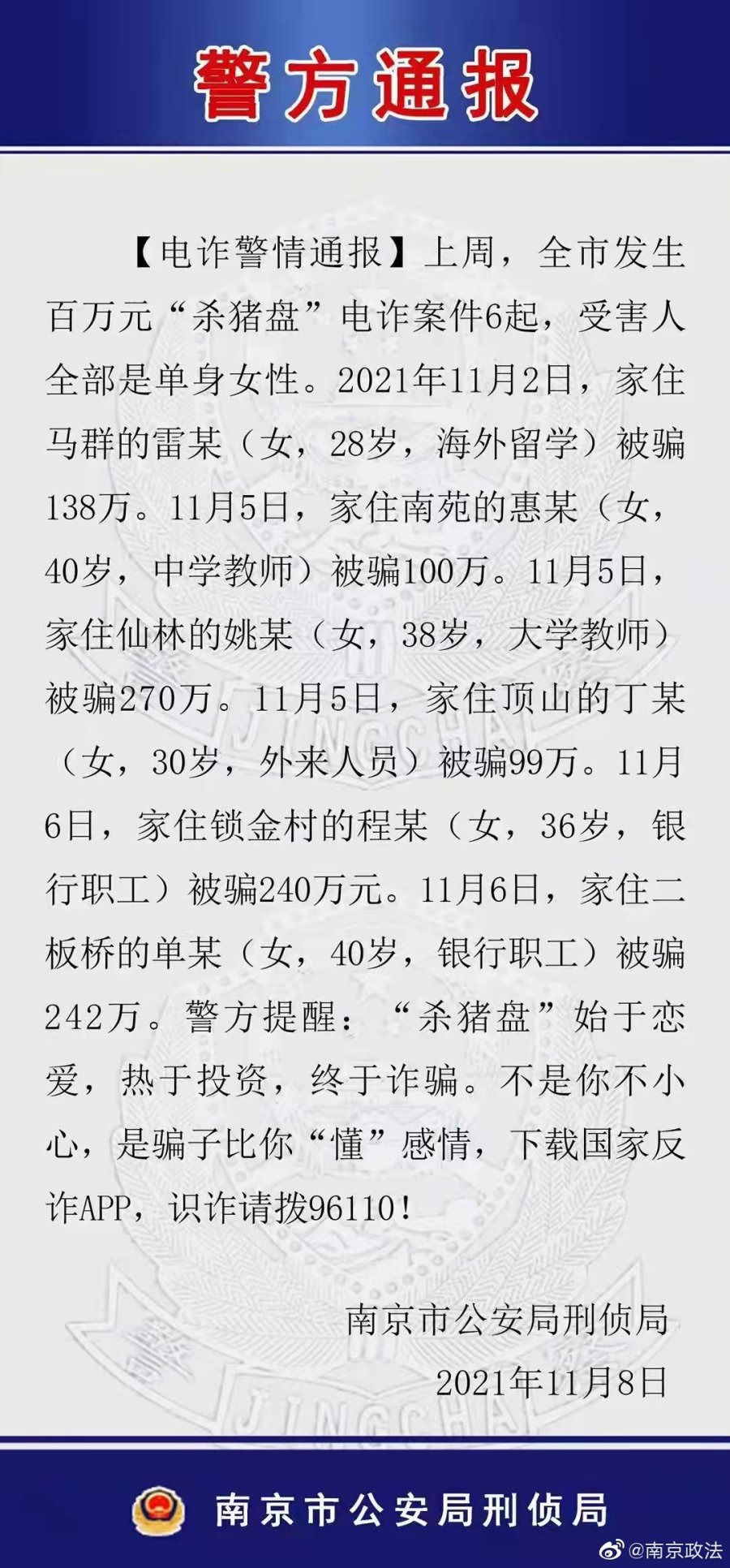 11月8日,南京市公安局刑侦局发布警情通报,称上周南京市发生百万元级“杀猪盘”电信诈骗案件6起,受害人全部是单身女性,其中一名大学教师被骗270万元,6名受害人合计被骗金额超过1000万元。警方提醒:“杀猪盘”始于恋爱,热于投资,终于诈骗。