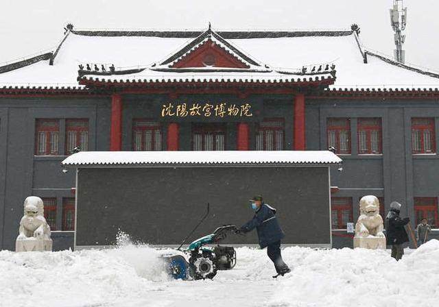 2021年11月8日,沈阳出现暴雪天气,在沈阳市沈河区的沈阳故宫门前,保洁人员在清理积雪。新华社记者 蔡湘鑫 摄