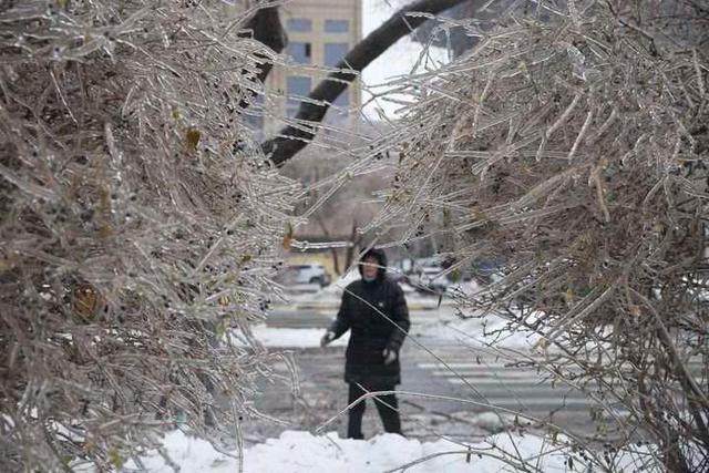 在长春市,道路上积雪混杂着雨水,泥泞难行,环卫车辆紧张作业。“我们凌晨3点半就出门了,昨天的暴雪和今天凌晨的冻雨给清扫工作带来困难。”长春市朝阳区环卫工人韩冬雪说。由于哈尔滨市遭遇罕见的冻雨天气,造成大树形成冰挂倒伏、折枝,路面结冰行路困难。