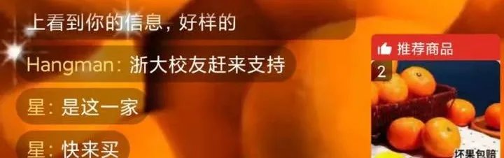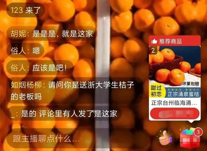 这是某电商平台上的一家卖蜜橘的网店。直播间里,有刚进来的人在急切询问:“是这家吗”“这是大学生说的那家吗”“请问你是送浙大学生橘子的老板吗”……