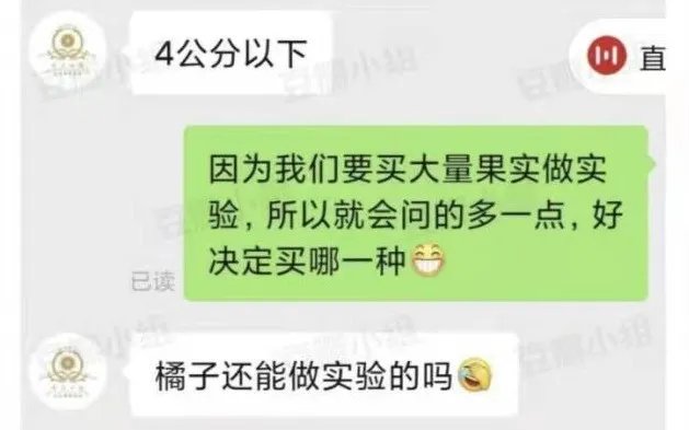 “当时跟老板咨询了橘子的情况,因为涉及到实验,所以问的问题比较多也比较详细,甚至箱子的长宽高,橘子的尺寸大小。担心老板多想,就跟他说明了是做实验用的。”