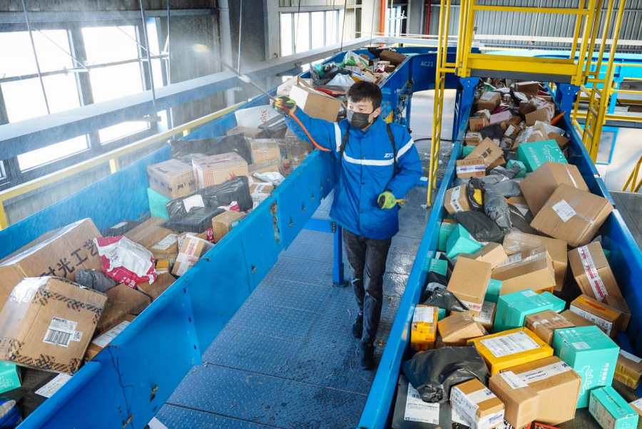 对于快递包装的具体消毒程序方面,中通快递有关人员表示,在青浦分拣中心,满载快件的车辆行驶到卸车口,工作人员会对车辆进行全面消毒。在分拣操作区,邮件放置到传送带上后,工作人员会使用分子雾化消毒器逐一对邮件进行消毒,在保证邮件全面消杀的同时,避免邮件被打湿。而在中通快递北京转运中心和京南转运中心,每个卸货平台均装有电动喷雾器,工作人员背负手动喷雾桶对传送带快件进行重点消毒。此外,快件到达网点后,网点工作人员在卸货前进行消毒;若涉及末端,末端工作人员进行对货架快件进行喷洒消毒。