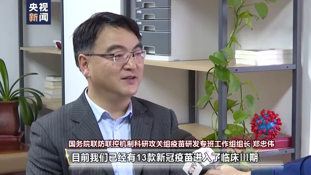 国务院联防联控机制科研攻关组疫苗研发专班工作组组长 郑忠伟:目前我们已经有13款新冠疫苗进入了临床三期,有四款疫苗已经获批附条件上市,有三款疫苗获批紧急使用,始终处于全球的第一方阵。为WHO设定的争取今年年底达到全球疫苗接种的目标,和明年年中达到全球疫苗接种的目标,作出应有的贡献。