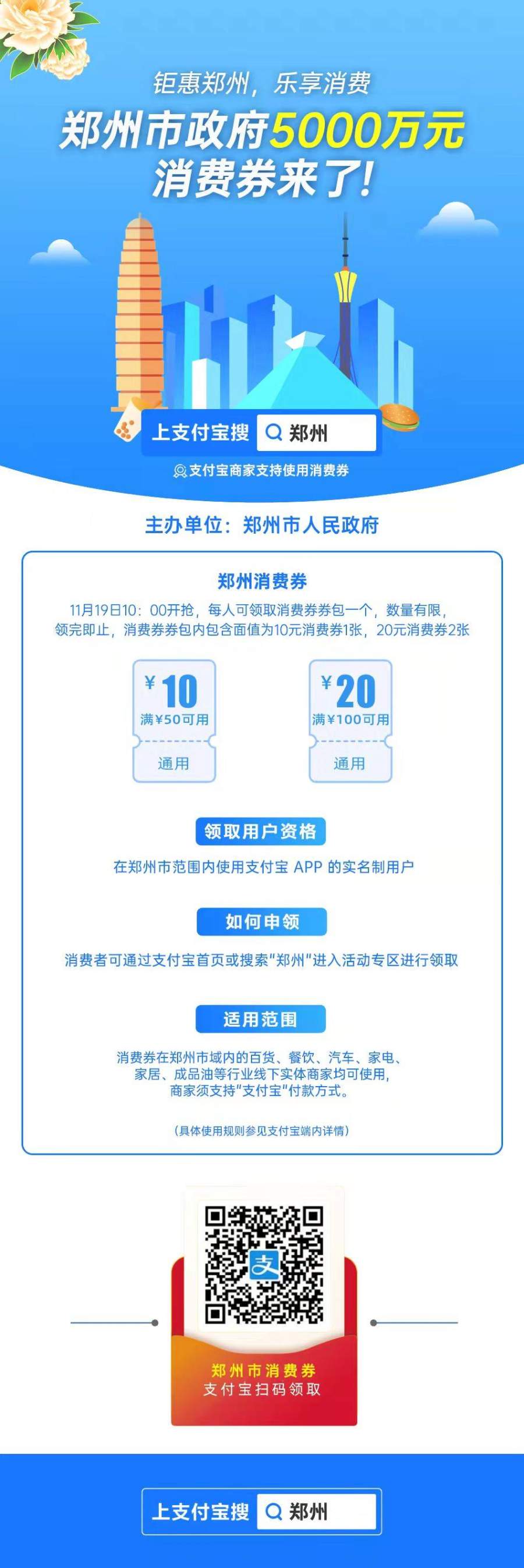 据了解,本期消费券以电子券形式发放,所有在郑人员(包括外地来郑人员)均可申领。消费者可通过“支付宝”或“郑好办”APP活动页面领取。共计发放5000万元,以券包形式发放,总计100万个。每个券包为50元,内含20元券2张、10元券1张。每人限领取1个券包,先领先得。