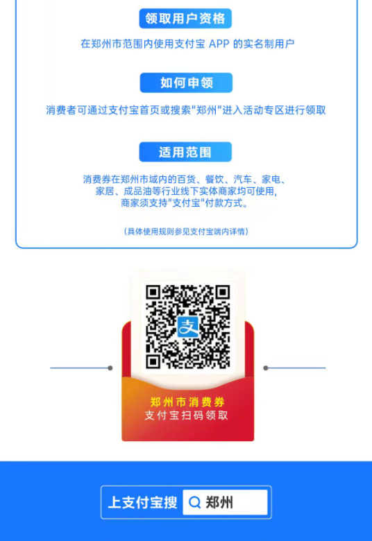 据了解,本期消费券以电子券形式发放,所有在郑人员(包括外地来郑人员)均可申领。消费者可通过“支付宝”或“郑好办”APP活动页面领取。共计发放5000万元,以券包形式发放,总计100万个。每个券包为50元,内含20元券2张、10元券1张。每人限领取1个券包,先领先得。