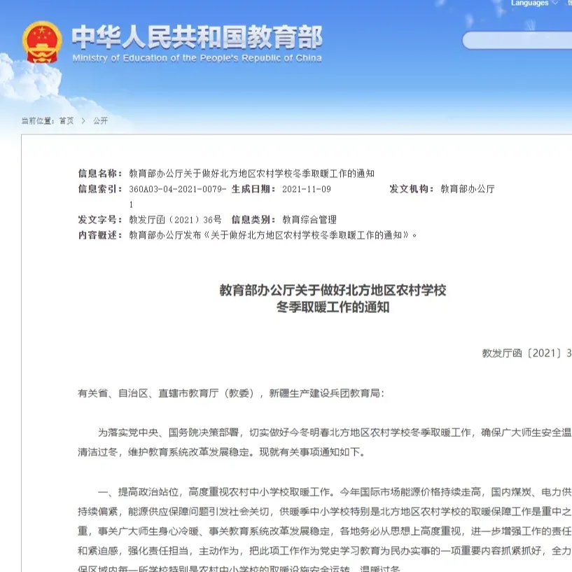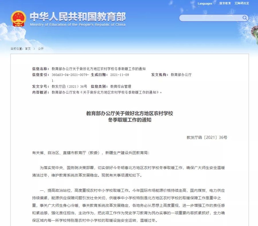 近日,教育部印发通知,要求做好今冬明春北方地区农村学校冬季取暖工作。全文如下: