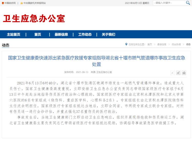 应急管理部派工作组赴湖北省十堰市燃气爆炸事故现场指导救援