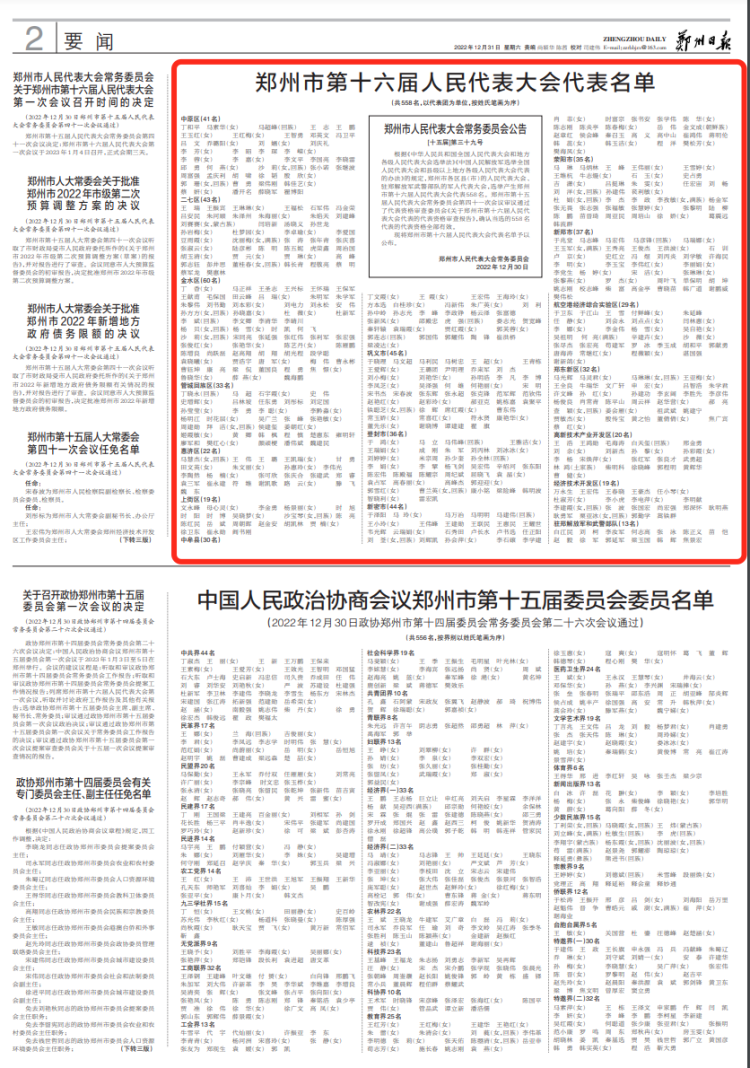 郑州市第十六届人民代表大会代表名单