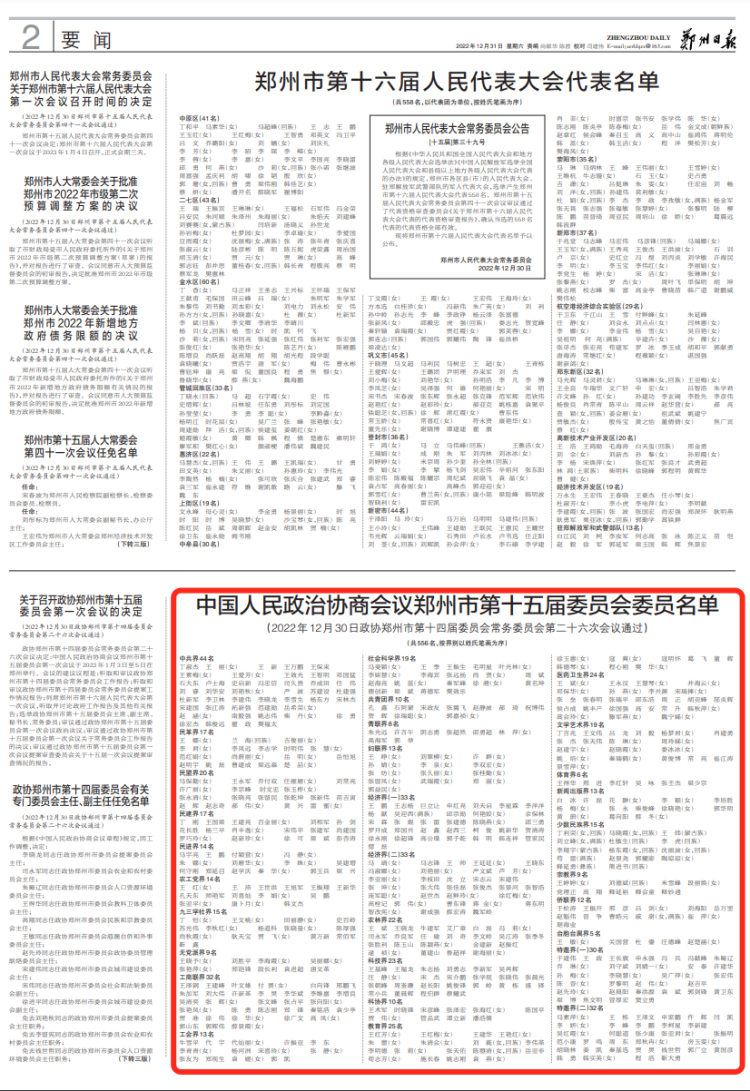 政协郑州市第十五届委员会第一次会议秘书处秘书长、副秘书长名单