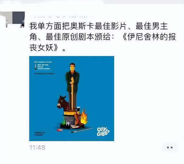 燃次元接触的一位电影平台发行人,其在奥斯卡所有奖项揭晓之后的第一时间,便在朋友圈发文表示,“我单方面把奥斯卡最佳影片、最佳男主角、最佳原创剧本颁给《伊尼舍林的报丧女妖》。”