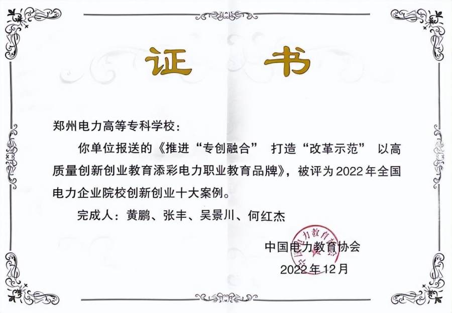 近年来,郑州电力高等专科学校以新时代“两越”匠心培养能源革命践行者、美好生活服务者,办人民满意的电力职业教育,在创新创业教育改革实践中深入探索,构建形成了电力特色大学生创新创业教育“专创融合6163模式”,卓越提升了学生的学习能力、实操能力、适应能力、创新能力,增值人才培养高质量、赋能学生核心竞争力、促进充分高质量就业,创新创业三大赛连创佳绩,学生荣获首届河南省大学生“创新之星”,项目入选河南省大学生创业培优计划,创新引领创业、创业带动就业,毕业生去向落实率连续三年98.50%左右,教育部高校就业反馈综合评价连续为A级。郑州电力高等专科学校在2022年全省高校就业创业工作会议典型发言(专科唯一),入选全国高校毕业生就业创业工作典型案例学校、河南省首批深化创新创业教育改革示范高校,荣获国家技能人才培养突出贡献单位、国家电网职业教育和技能人才队伍建设先进集体、“河南省五一劳动奖状”,高质量发展硕果及经验被中央广播电视总台新闻频道、《人民日报》《光明日报》《中国教育报》《河南日报》等主流媒体宣传推广。