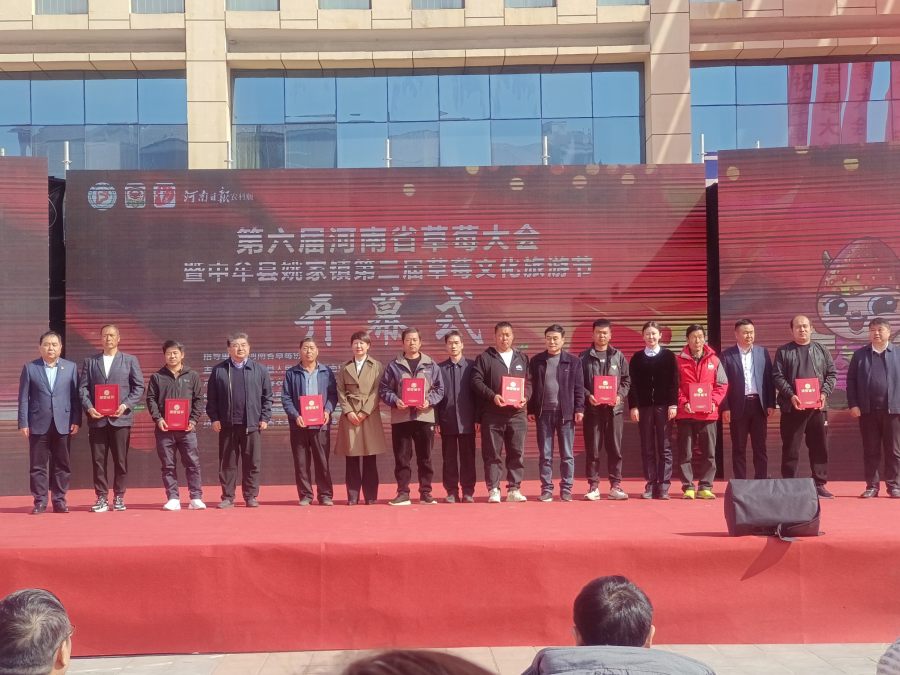 开幕式上,中国园艺学会草莓分会授予中牟县“中国草莓之乡”荣誉称号,河南省草莓协会授予中牟县姚家镇草莓产业园“河南省百县草莓标准示范园”荣誉称号,并为“草莓专家工作站”揭牌,为“中牟县草莓致富之星”和“中牟县草莓种植能手”获得者颁奖。